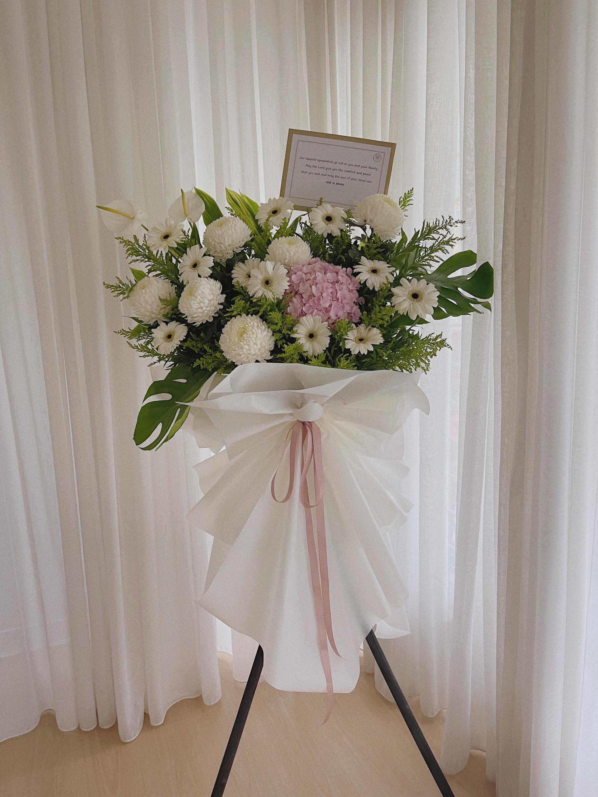 HUA’s condolence flower stand, arrange with White Chrysanthemum Paper Mum, White Gerbera, White Anthurium, Pink Hydrangea and foliage. (Hydrangea can change to white / blue or green, subject to availability)